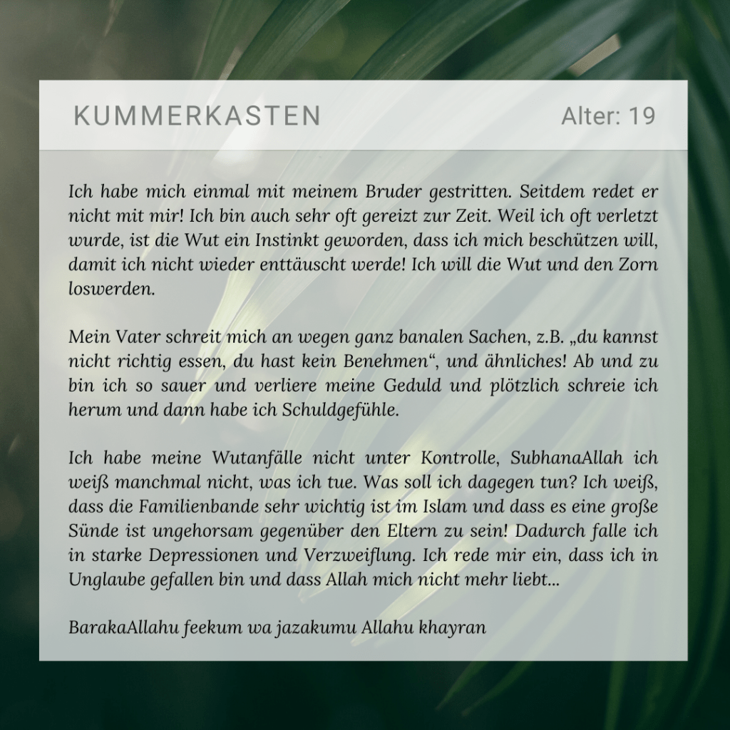 Sei dir stets darüber bewusst, dass du mit der Erlaubnis von Allāh, Kontrolle über deine Gefühle hast und dich nicht von ihnen kontrollieren lassen solltest. Dies ist nicht immer einfach, vor allem, wenn es zu einem Muster geworden ist. Jedoch ist die Erkenntnis der erste Schritt, den du bereits gegangen bist.