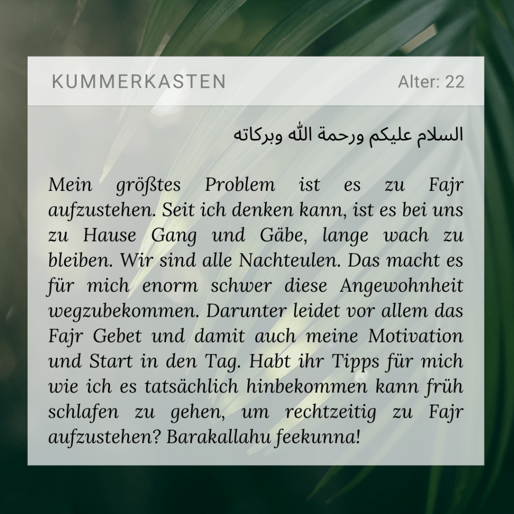 Du kannst dich auch mit einer Schwester zusammentun und ihr weckt euch gegenseitig mit einem Anruf für Fajr. Falls das nichts für dich ist und du einen tiefen Schlaf hast, kann dir die App „Alarmy“ helfen. Dort musst du Aufgaben lösen, um den Wecker ausschalten zu können. Man verbindet das Geräusch des Weckers oder das kontrollierte Aufstehen mit etwas Nervigem. Daher ist es wichtig zu verstehen und zu verinnerlichen, dass Allah dir einen weiteren Tag schenkt und dich aus deinem Schlaf, dem kleinen Tod aufweckt, um Ihm zu dienen. Ein weiterer Tag bedeutet eine weitere Gelegenheit dem Herrn der Welten näher zu kommen!