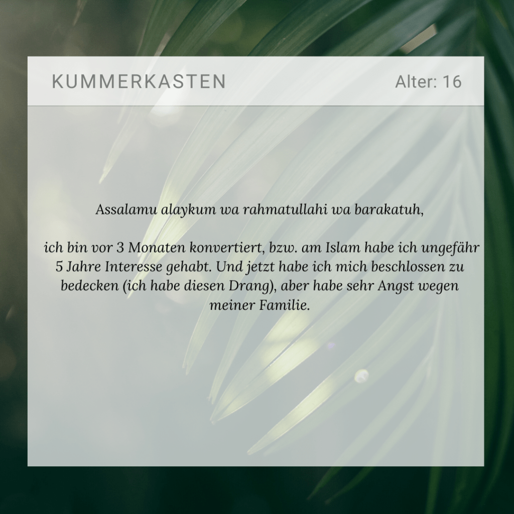 Du hast über Jahre hinweg Interesse am Islam gehabt, alhamdulillah und hast dann in so einem jungen Alter den Islam angenommen, allahumma barik. Du hast so einen großen Schritt gemacht und jetzt hast du dir den nächsten Schritt vorgenommen. Sieh diese Absicht, die du im Herzen hast als eine weitere Einladung und Rechtleitung Allahs, dass Er dir erlaubt, dich für Ihn zu bedecken. Du hast die Stärke und den Willen in dir, alhamdulillah, den Hijab zu tragen und wenn ich es geschafft habe, dann schaffst du es erst recht. Es wird mit Allahs Erlaubnis alles gut gehen. Manchmal braucht es nur mehr oder weniger Zeit, wodurch Allah unsere Geduld und Standhaftigkeit prüft. Wenn es Probleme geben sollte, tausche dich mit rechtschaffenen Schwestern aus, die dir gute Ratschläge geben und dich aufmuntern. Du kannst uns auch gerne nochmal anschreiben und wir können reden.