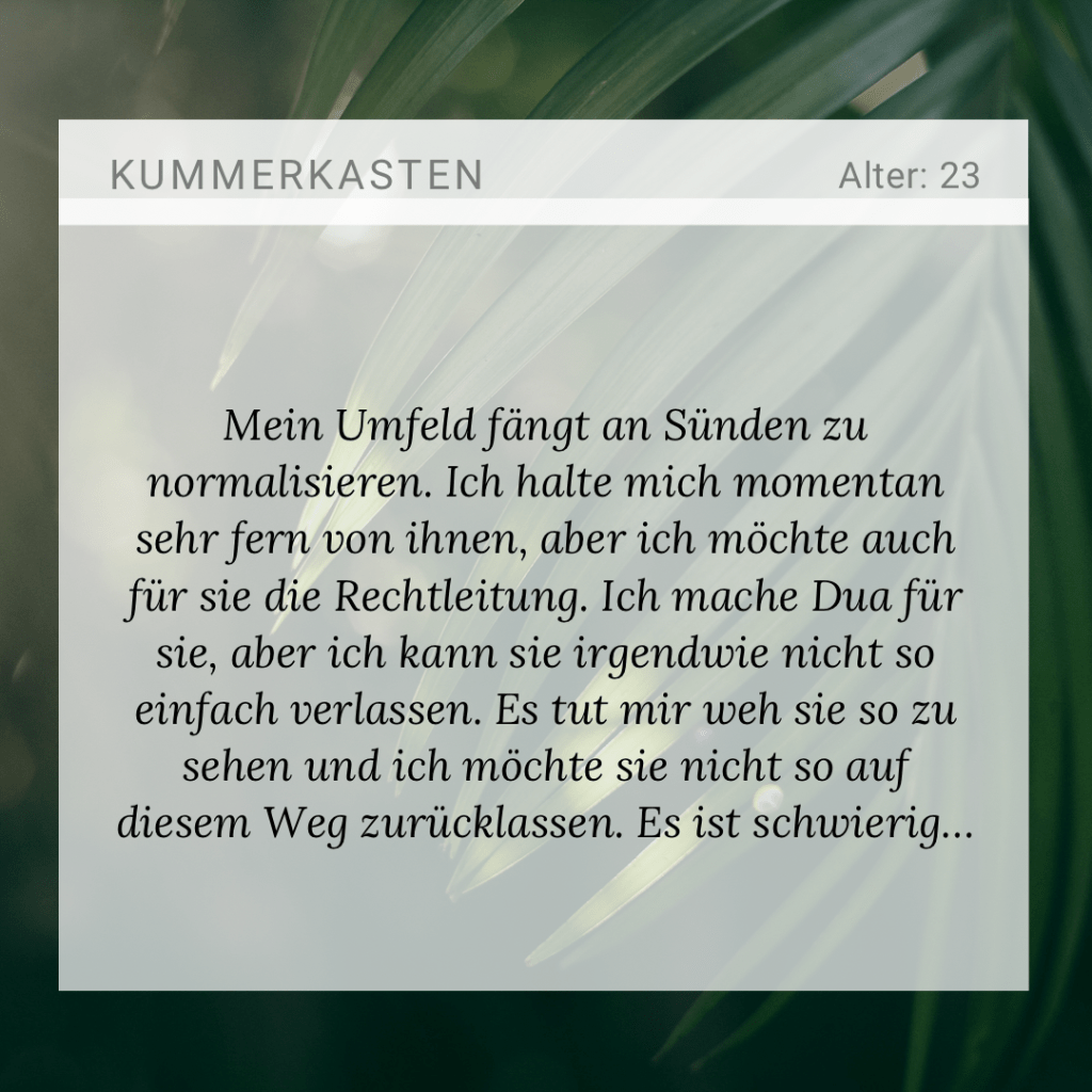Möge Allah dich für deine Absicht belohnen und dir Erleichterung geben. Ich weiß aus Erfahrung, dass man manchmal in einem Dilemma steckt, wenn man sieht, wie seine Liebsten Sünden begehen. Problematisch wird es vor allem, wenn es für einen persönlich normal wird. Das Herz wird dadurch hart. Ich würde im Allgemeinen niemandem dazu raten, den Kontakt abzubrechen. Dies wäre der aller letzte Schritt, wenn jede andere Möglichkeit ausgeschöpft wurde und die jeweiligen Personen die persönlichen Grenzen – also das Unterlassen von Sünden – nicht akzeptieren und sich widersetzen.