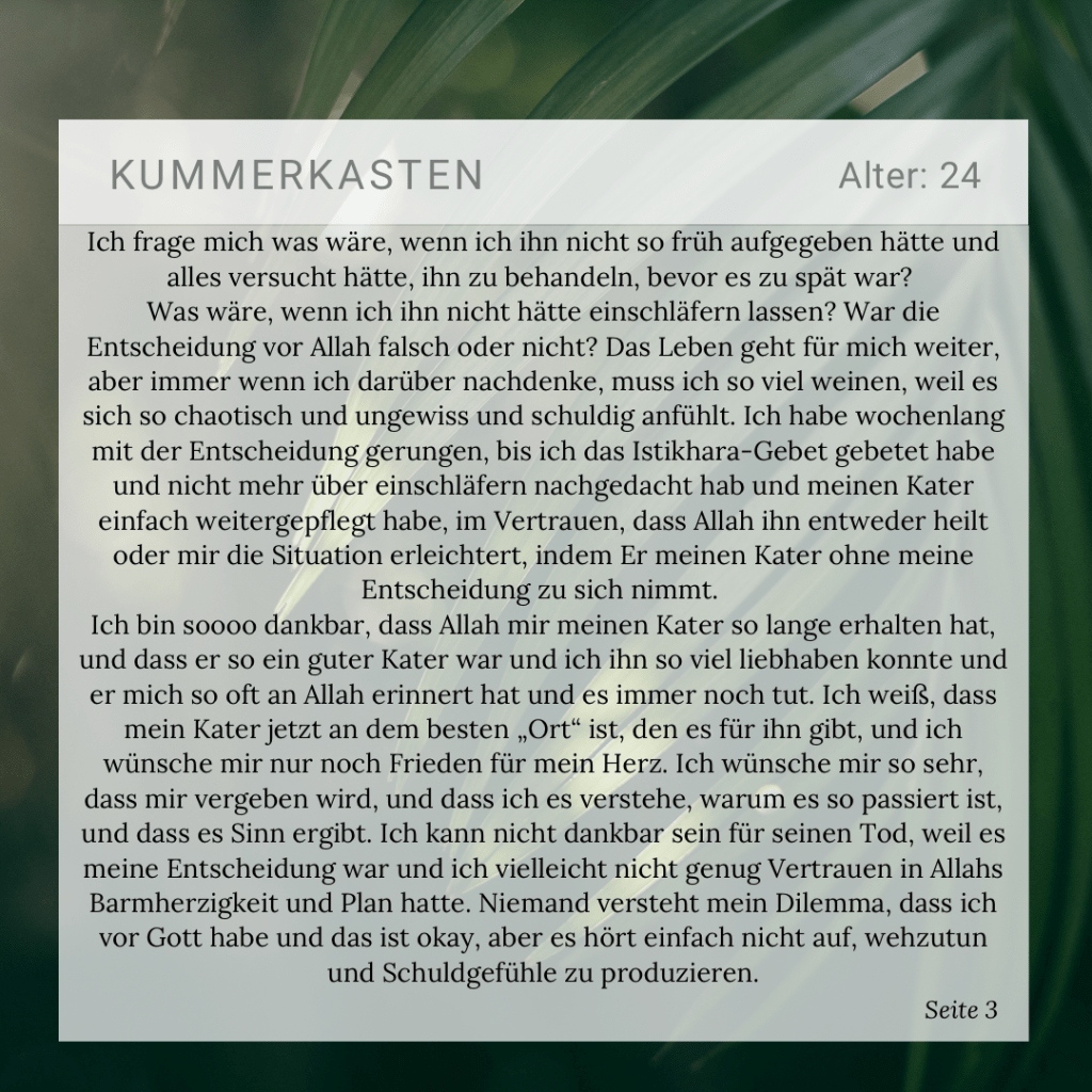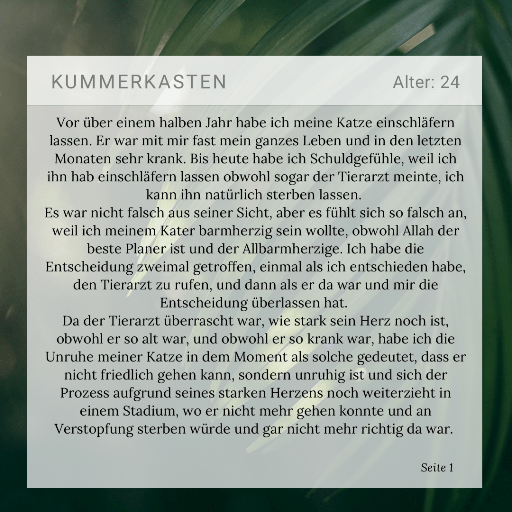 Liebe Schwester, wir sind nicht dazu befugt, zu beurteilen wie islamisch richtig oder falsch es gewesen ist oder ob dies überhaupt ein Fehler gewesen ist. Denn selbst der Arzt sagt, dass dies aus seiner Sicht nicht falsch gewesen ist. Aber du hast in diesem Moment das beste nach deinem Wissen und Ermessen angestrebt. Du hast dich aus einem ganz bestimmten Grund entschieden, ihn einschläfern zu lassen. Du wolltest das Gute für deinen Kater! Deine Absicht war keinesfalls eine schlechte! Das, was zählt, ist deine Bemühung, Absicht und Einsatz, das Beste getan zu haben. Und das hast du getan! Wir sollten uns niemals fragen, wie es gewesen wäre, wenn wir uns doch anders entschieden hätten, da wir uns dann auf den Teufel einlassen. Die Einflüsterungen werden mehr und das Herz verspürt nur eine Unruhe und Schuldgefühle. Jedoch ist dies überhaupt nicht erwünscht im Islam.