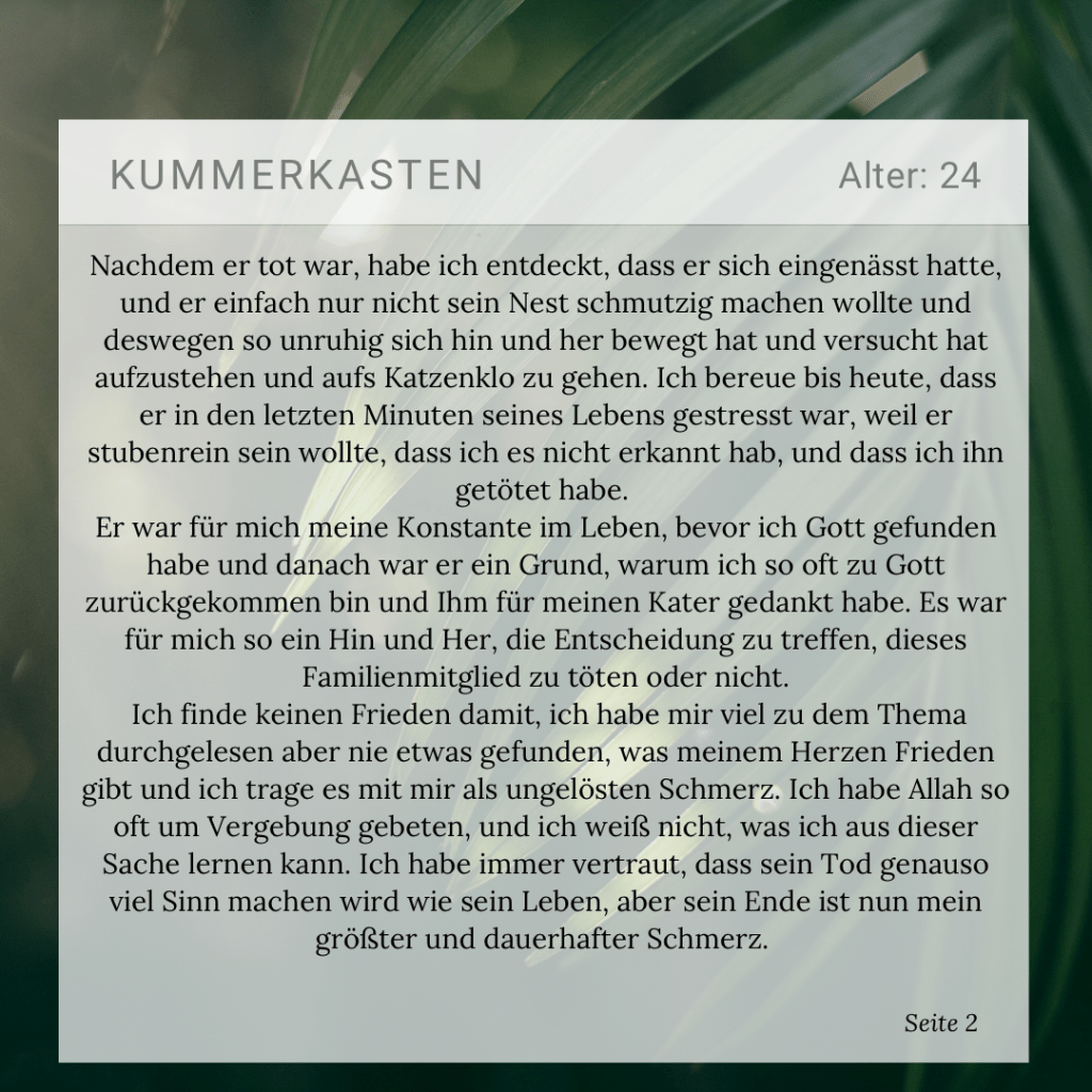 Ich kann dein Dilemma total nachvollziehen, da wir selbst in der Familie schon einige Katzen/Kater hatten. Man kann auch ganz schön herauslesen, wie nah dir dein Kater stand. Das ist etwas Wunderschönes, da Allah dich mit so einem Herz geschenkt hat. Wie schön, dass dieser Kater dich auch so viele Male deinem Herrn nähergebracht hat. Das ist ein Segen!