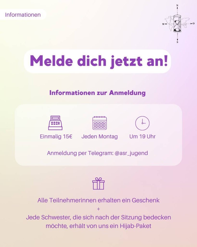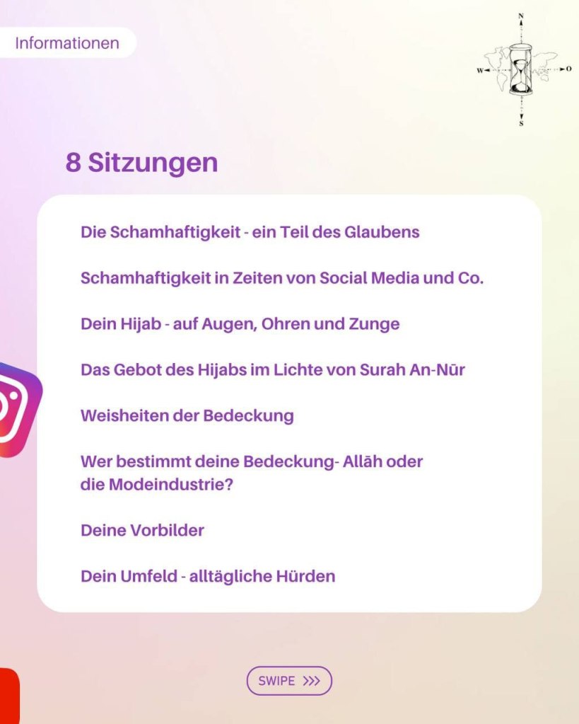 „Dein Hijab in Zeiten von gesellschaftlichem Schönheitswahn“ ist eine Reihe, die wir in shaa Allāh ab Juni bis Ende August behandeln werden. Die Sitzungen finden über Telegram jeden Montag um 19 Uhr in shaa Allāh statt. Für die Anmeldung ist eine einmalige Gebühr von 15 Euro zu entrichten. Nach der Anmeldung erhaltet ihr über Telegram alle weiteren Informationen.