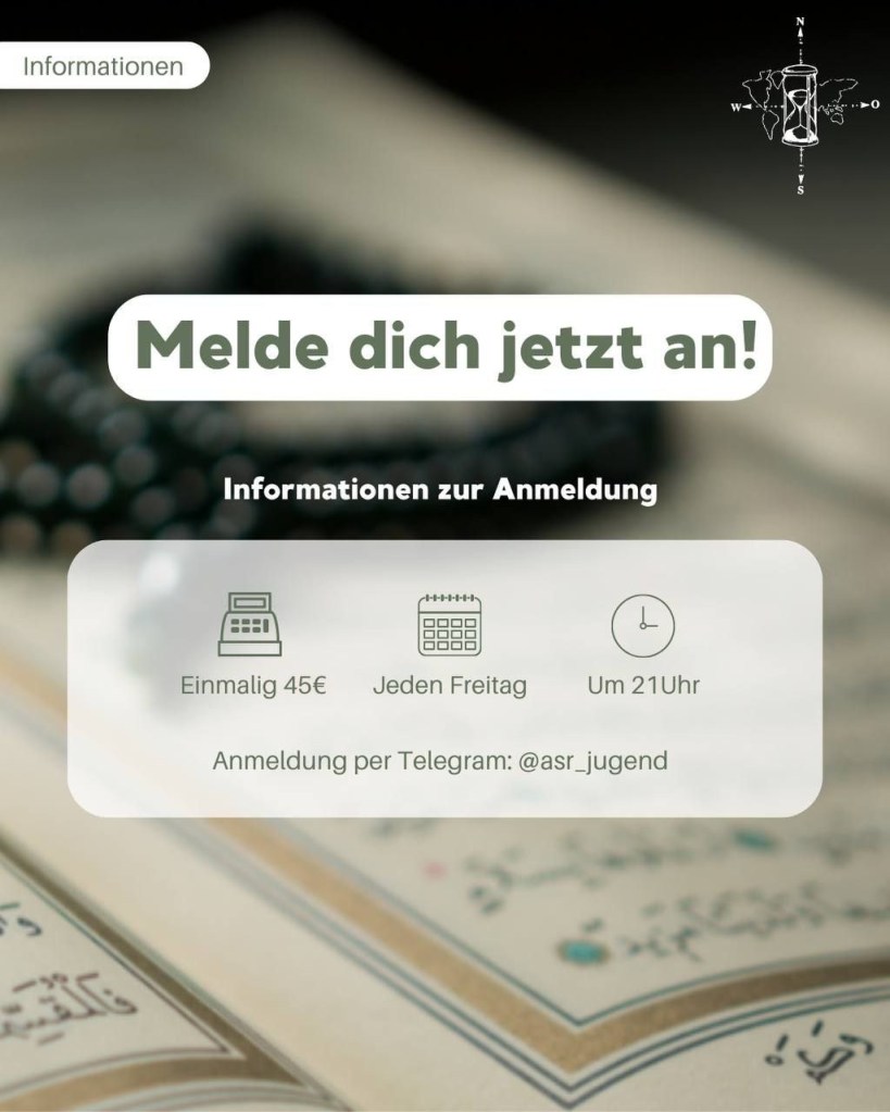 Der Lesefestigungskurs ist ein Qurān Unterricht, den wir in shaa Allāh ab Juni bis Ende August anbieten werden. Die Sitzungen finden über Telegram jeden Freitag um 21 Uhr in shaa Allāh statt. Für die Anmeldung ist eine einmalige Gebühr von 45 Euro zu entrichten. Nach der Anmeldung erhaltet ihr über Telegram alle weiteren Informationen.