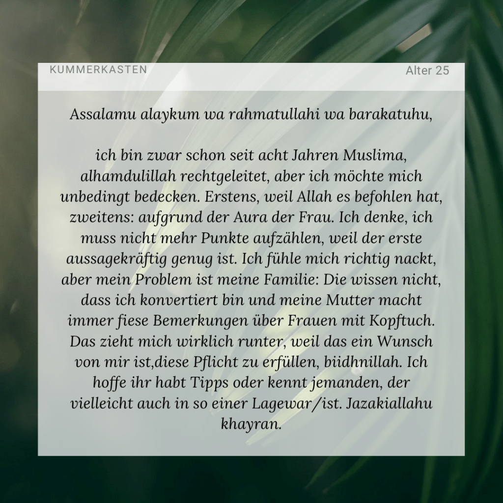 Liebe Schwester, bevor wir näher auf dein Anliegen eingehen, möchten wir dir einige Fragen stellen, über die du nachdenken solltest, um so zu einer Lösung zu kommen in shaa Allāh. Frage dich, was genau hält dich wirklich davon ab, dich für Allāh swt zu bedecken? Liegt es wirklich nur an deiner Familie oder geht es um etwas viel Tiefgründigeres? Manchmal bedrückt uns etwas Tieferes, was nicht immer mit unserem Umfeld zu tun hat, sondern mit inneren Ängsten oder Blockaden.