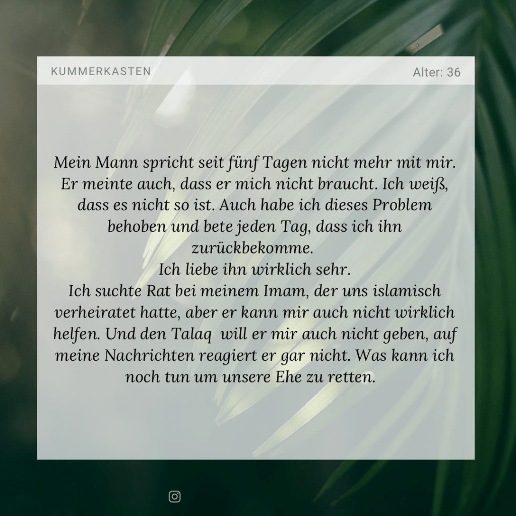 Wir können dir eine psychologische Beraterin @find.yourself_be.yourself empfehlen. Jedoch sollte dies lieber persönlich in eurer Nähe geklärt werden. Fragt bitte in den Moscheen in eurer Nähe nach, ob es jemanden gibt, der sich eures Falls annehmen würde. Meistens haben Moscheen solche Kontakte. Es gibt auch den Psychologen Amin Loucif, der Eheberatungen anbietet, falls ihr in NRW wohnen solltet. Als letzte Möglichkeit können wir euch anbieten, dass dein Mann @fajr_jugend kontaktiert und sie zunächst privat miteinander reden. Er ist ein Ustadh, der sich mit solchen Thematiken auskennt. Er kann mit ihm islamisch korrekt reden und ihm Nasihat geben. Möge Allah euch Erleichterung geben und dem Shaytan keine Chance geben, zwischen euch Unheil zu stiften. In shaa Allah kann dies so schnell wie möglich gelöst werden. Fi amanillah, liebe Schwester