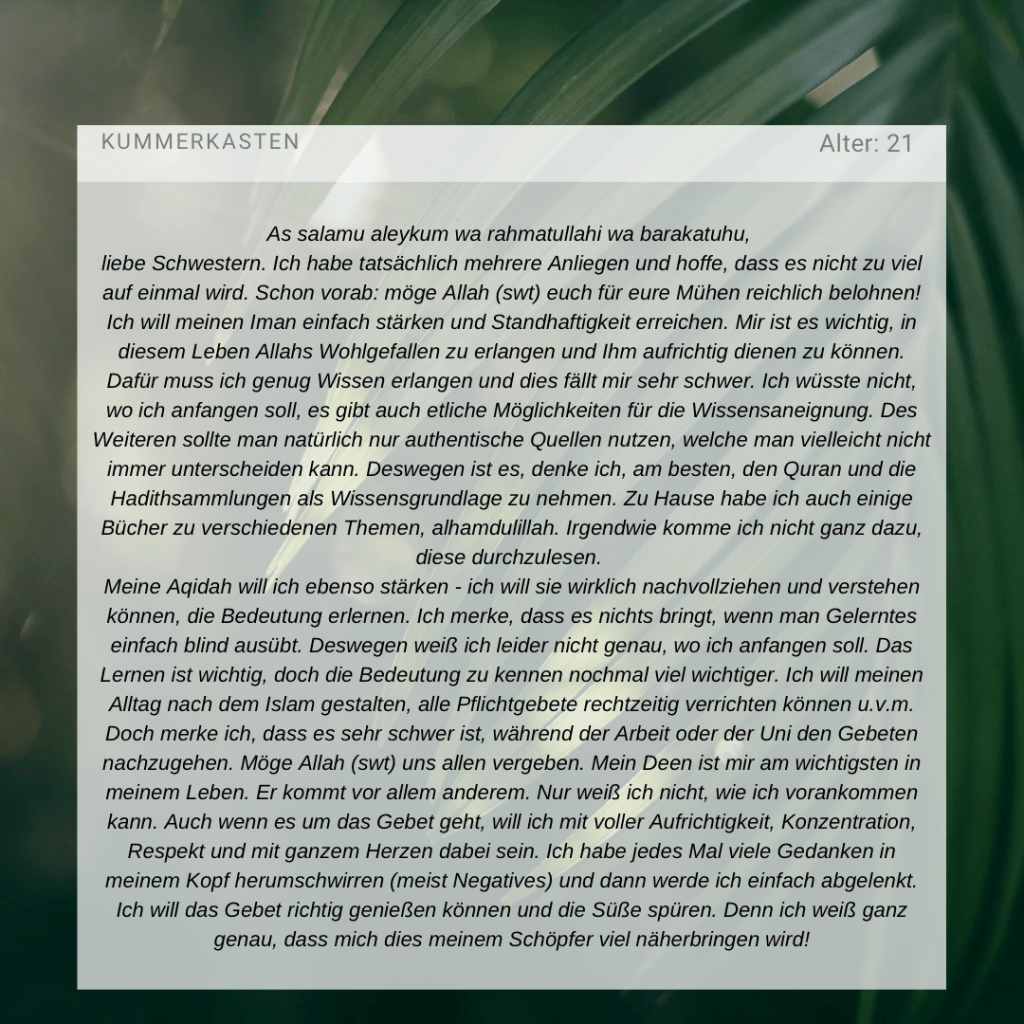 Jedoch sind Aqidah, Quran, Dhikr, Fiqh etc. die Puzzleteile, die uns festigen, unser Herz reinigen und heilen und von den Fallen des Shaytans fernhalten. Des Weiteren sind wir Laien, die keinen Überblick über Ahadith und Rechtsurteile haben. Daher ist es wichtig, diszipliniert und regelmäßig an derartigen Unterrichten teilzunehmen und einen Lehrer oder eine Lehrerin zu haben, an denen man sich orientiert. Deshalb ist unsere Empfehlung, dir zunächst einen Lehrer/Lehrerin zu suchen, der dich begleiten und dir Ratschläge bei deiner Entwicklung geben kann und so nach und nach die oben genannten Themen zu erlernen.
