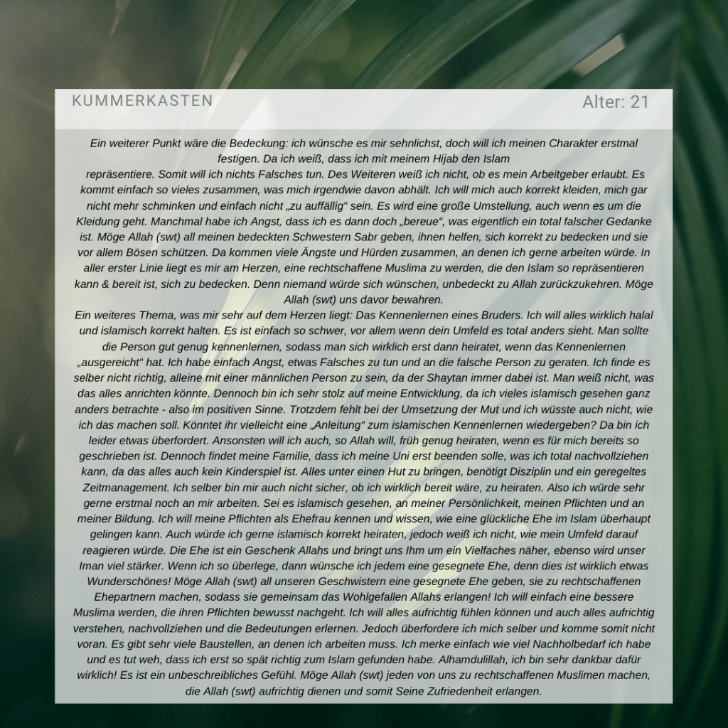 Zum Hijab kannst du dir ebenfalls folgende Beiträge durchlesen: https://asrjugend.com/2023/05/07/kummerkasten-19/ https://asrjugend.com/2023/05/07/2628/