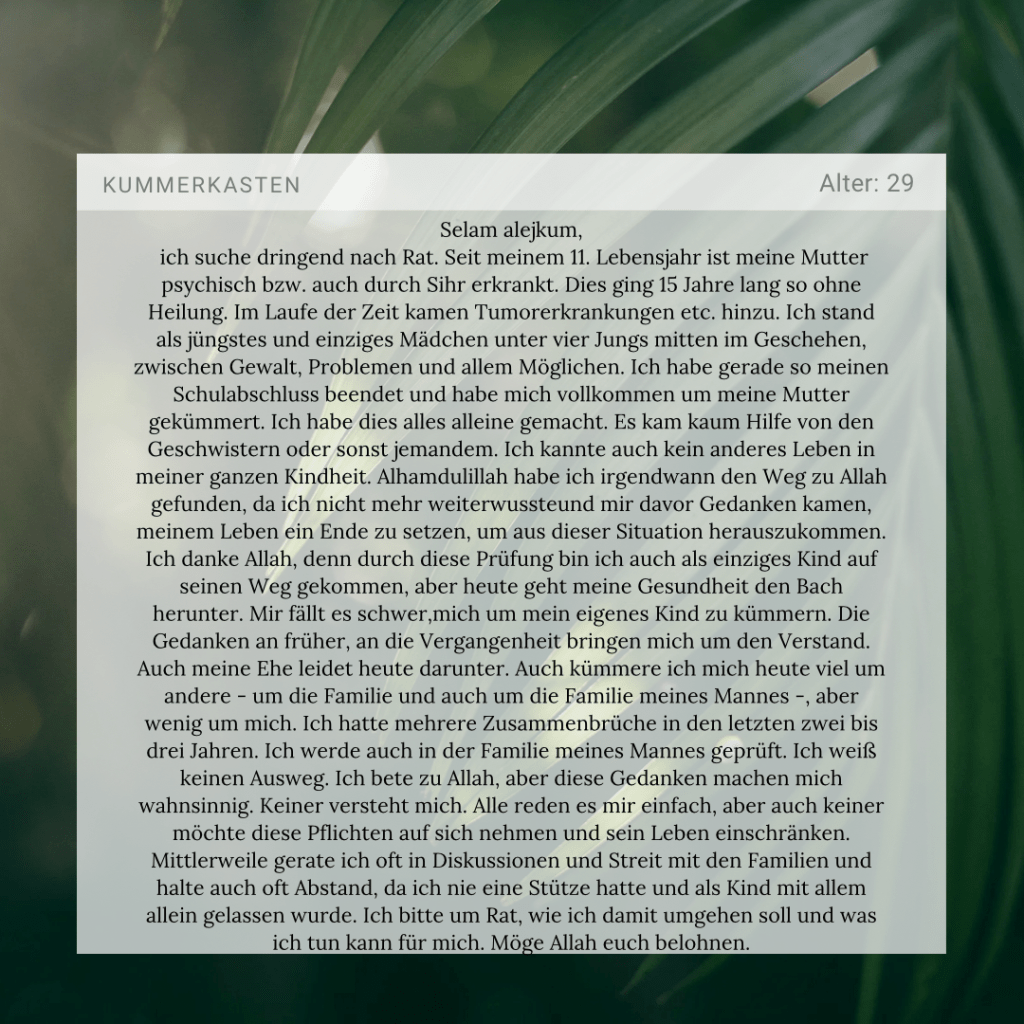 Zuletzt möchte ich dir sagen, dass du als Mutter auch nicht alleine mit diesem Problem bist. Du hast große und tiefe Wunden, die heilen müssen. Und du hast sehr schlimme Dinge erlebt, die dich aber Alhamdulillah stärker gemacht haben. Nicht einmal die Mütter der Propheten blieben vor Prüfungen verschont, SubhanAllah. Aber genau das ist jetzt deine Prüfung und dein Jihad, der dich vielleicht, wie du sagst, wahnsinnig macht, aber jetzt musst du dich darauf konzentrieren, dass du eine glückliche und gesunde Mama wirst. Sei für dein Kind die Mama, die du dir gewünscht hättest. Stelle dir einmal vor, was für Früchte in Zukunft auf dich warten, weil du versuchst, das Bestmögliche für dein Kind zu tun. Du bist 24/7 für dein Kind da. Du machst als Mutter und Ehefrau einen Vollzeitjob im Bereitschaftsdienst, jeden Tag 24 Stunden die ganze Woche ohne Pause und dein Lohn wird in shaa Allah dein Kind sein, das irgendwann als Erwachsener vor dir steht und von dir erzogen wurde!