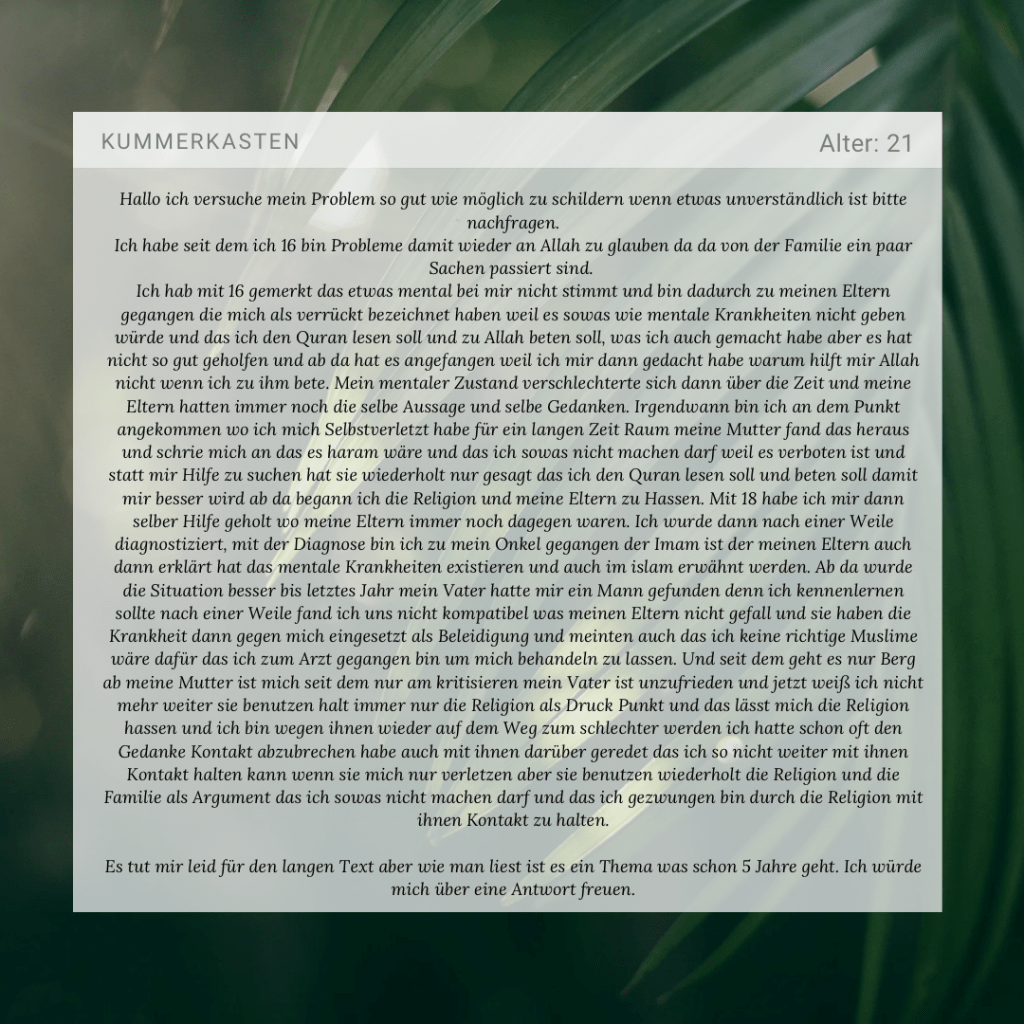 Alhamdulillah, dass du dir zu der Zeit der Krankheit Hilfe gesucht hast. Man kann vieles, wie deine Eltern auch gesagt haben, mit einer stärkeren Bindung zu der Religion heilen. Manchmal muss man aber eben doch professionelle Hilfe in Betracht ziehen und sich von einem Arzt behandeln lassen. Deine Eltern haben aber kein Recht, dich als schlecht oder nicht Muslima zu bezeichnen. Mentale Krankheiten existieren und durch die Hilfe von einem Arzt werden wir nicht zu Ungläubigen. Man muss es verurteilen, wie deine Eltern die Religion so gegen dich missbrauchen. Es ist sehr stark von dir, dass du dich trotz allem, alleine deiner Krankheit gestellt hast. Vielleicht haben deine Eltern das damalige Gespräch mit deinem Onkel über mentale Krankheiten vergessen und sie brauchen eine Erinnerung.