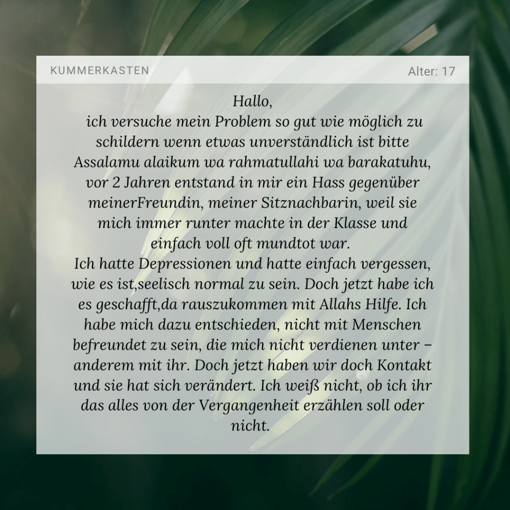 Dementsprechend raten wir dir, meine liebe Schwester, wenn sich deine Freundin bzw. Sitznachbarin verändert hat und ihr nun einen gesunden, engeren Kontakt zueinander pflegt, dass du dir Gedanken darüber machst, wie wichtig es für dich ist, dass sie deine Vergangenheit kennt.