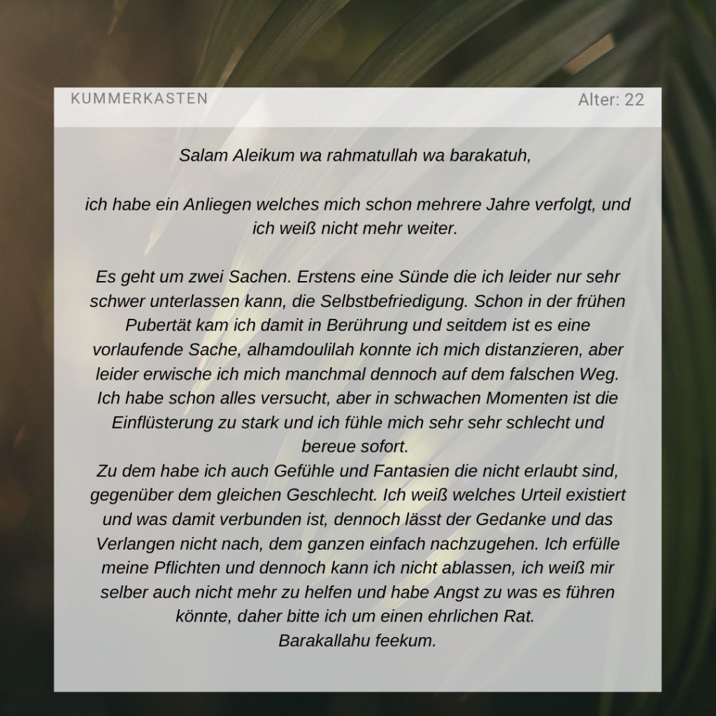 Abu Umamah (radiyallahu ‚anhu) berichtete: „Einmal kam ein Jugendlicher zu Nabi (sallallahu ‚alayhi wa sallam) und sagte: ‚Erlaube mir, Zina zu begehen.‘ (…) Statt ihn anzumeckern, lehrte der Prophet auf eine sehr kluge Weise die Falschheit dahinter, denn er wusste, dass er jung ist und mit seinen Gelüsten zu kämpfen hatte – weitere Überlieferung, die besonders gut auf deine Situation zutrifft, weil auch die Gefährten des Gesandten Allahs (Allahs Frieden und Segen seien auf ihm) wurden von ihren Gedanken gequält. Schau dir an, was der Rat des besten Gesandten ist. Abu Hurayrah (möge Allah mit ihm zufrieden sein) sagte: „Einige der Gefährten des Gesandten Allahs (Allahs Frieden und Segen seien auf ihm) kamen zu ihm und sagten: „Wir haben Gedanken, die zu schrecklich sind, um sie auszusprechen. Er sagte: Leidet ihr wirklich darunter? Sie antworteten: Ja. Er sagte: Das ist ein deutliches Zeichen des Glaubens“ (Muslim). Grundsätzlich solltest du wissen, dass Allah jeden Menschen unterschiedlich prüft. Dies könnte also deine Prüfung sein, für die du belohnt werden kannst. Viele Geschwister haben aufgrund ihrer Vergangenheit das Verlangen, Zina zu begehen. Sie müssen ihre Lust aber genauso kontrollieren lernen, wie du auch. Gleichgeschlechtliche Anziehung, Selbstbefriedigung sind Teil dieses Verlangens. Du musst dich selbst beobachten und schauen, welche Situationen zu diesen Gefühlen geführt haben. Beispielsweise zeigen wissenschaftliche Studien, dass Selbstbefriedigung und pornographische Inhalte langfristig zur gleichgeschlechtlichen Anziehung führen können. Dementsprechend musst du bestimmte Dinge meiden und Abstand dazu suchen, die dein Verlangen verstärken. Wie Pornographie, „Freunde“, die es als normal ansehen und darüber reden, sich diesen Gedanken oder Selbstbefriedigung hinzugeben, und auch alle weiteren Dinge, bei denen du weißt, dass sie deine Begierden fördern.