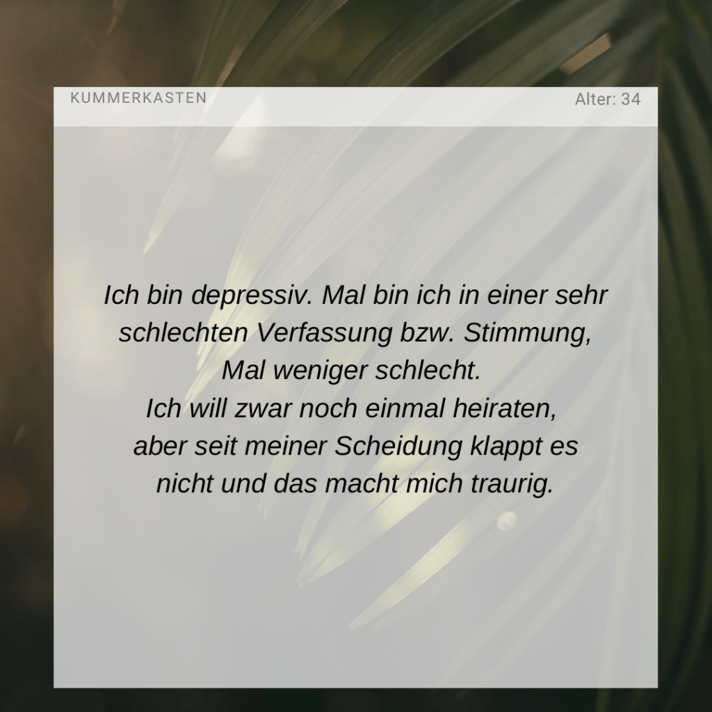 Wisse bitte und vertraue auch darauf, dass deine Depressionen – so Allah will – mit der Zeit immer weniger werden, die (gute) Zeit zwischen deinen depressiven Episoden länger werden wird und du so wieder am normalen Leben Schritt für Schritt teilhaben können wirst. Möge Allah dich vollständig heilen. Fi Amanillah